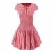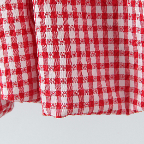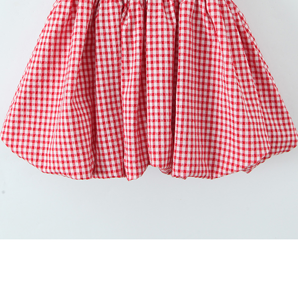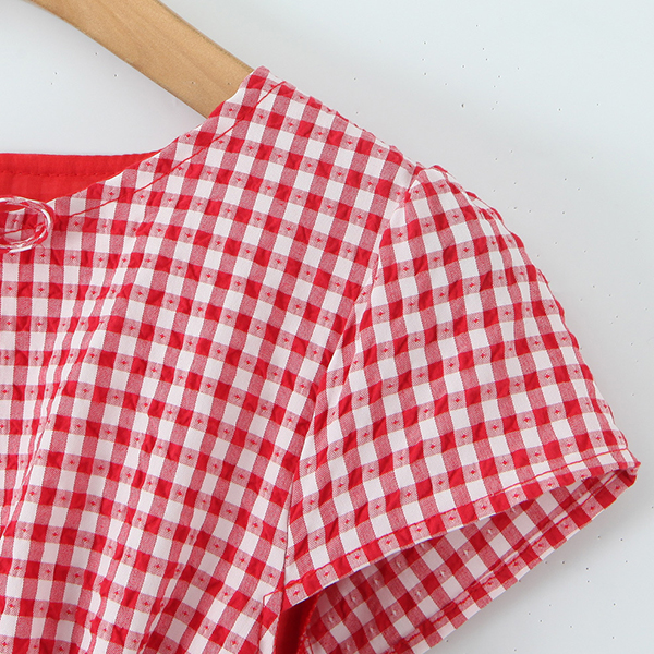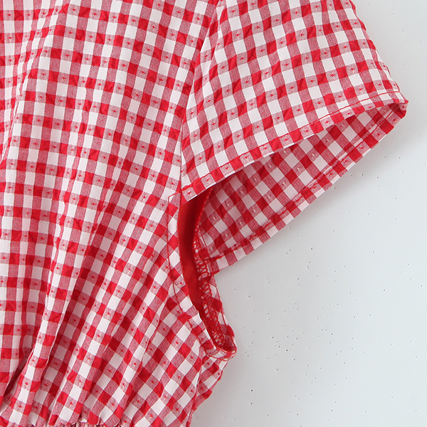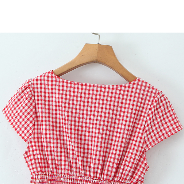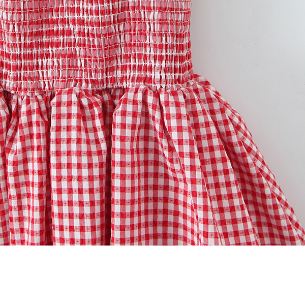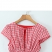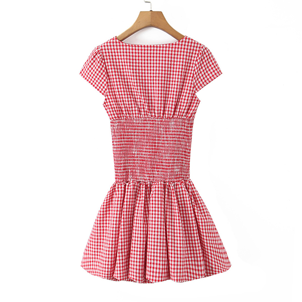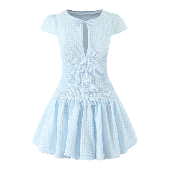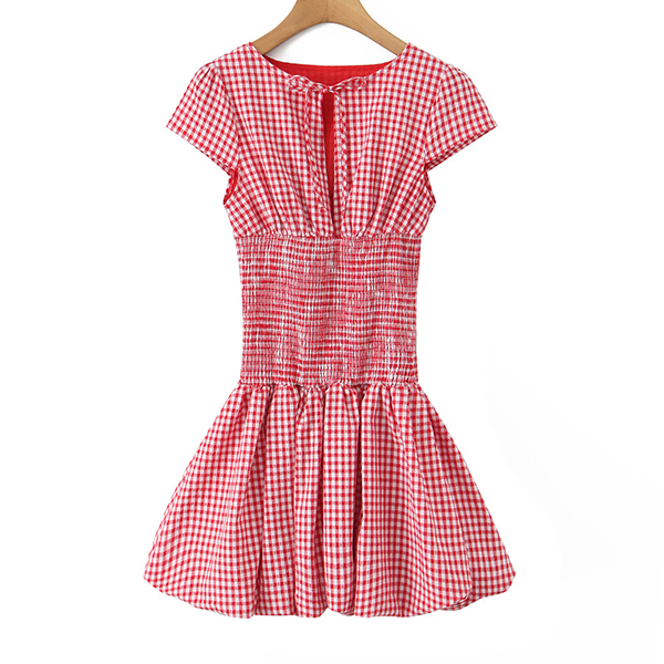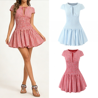 Fashion Self-tie Crew Neck Cap Sleeve Smocked Waist Ruffle Hemline Plaid Mini Dress
