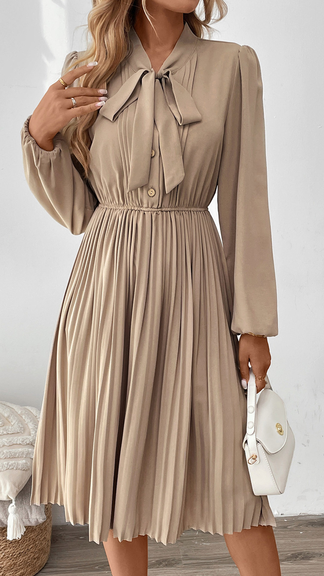 This dress features self-tie neckline design, long sleeve, and high-rise. The pleated skirt adds volume and movement to the dress, making it elegant and sophisticated. The dress is versatile and can be worn to work, a special occasion, or a night out, depending on how you style it. Wanna have a try?