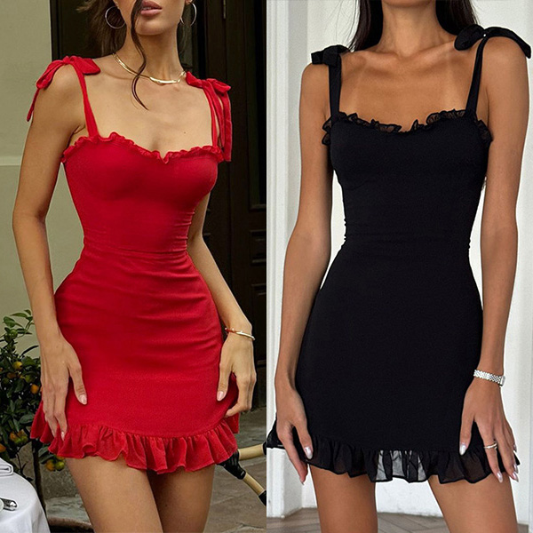 This stylish bodycon dress features self-tie shoulder straps for an adjustable and feminine touch. The fitted silhouette accentuates your curves, while the ruffle hemline adds a playful and elegant flair. Perfect for brunches, date nights, or casual parties.