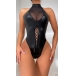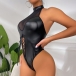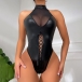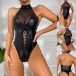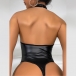 Fashion Semi-gauze Spliced Lace-up Backless Halter Artificial Leather PU Lingerie Bodysuit