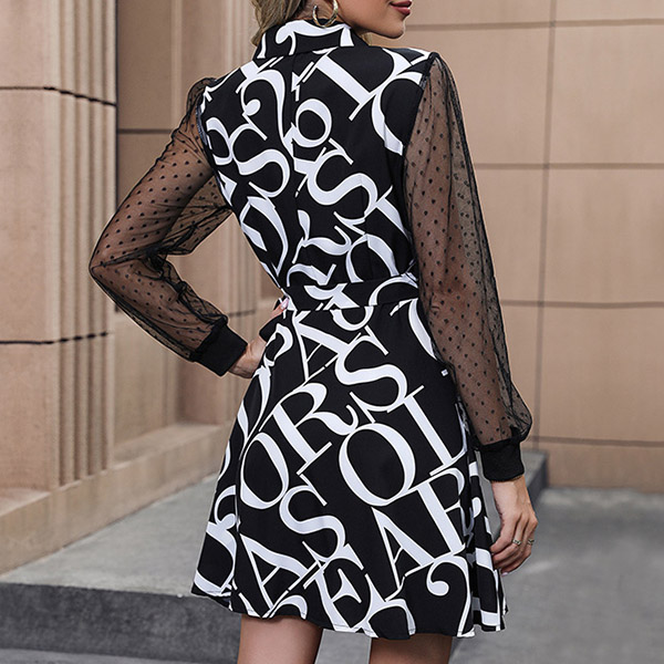 Fashion Semi-through Gauze Spliced Long Sleeve V-neck Printed Wrap Dress