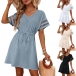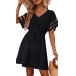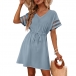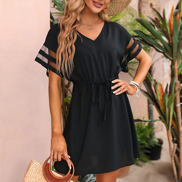 Fashion Semi-through Gauze Spliced Short Sleeve V-neck Drawstring Mini Dress