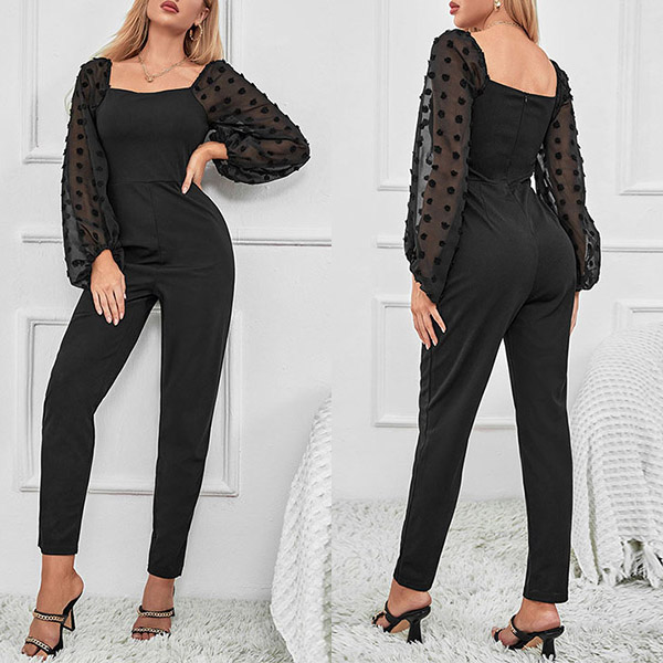 What makes this jumpsuit stand out of crowd? It is the semi-through gauze spliced long sleeve with swiss-dot details! Black color, square-cut neck, and slim fit silhouette. Wanna have a try?