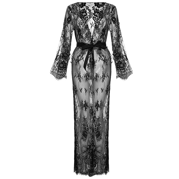 Fashion Semi-through Lace Two-piece Nightwear Set Consist of Longline Lace Robe and Belt