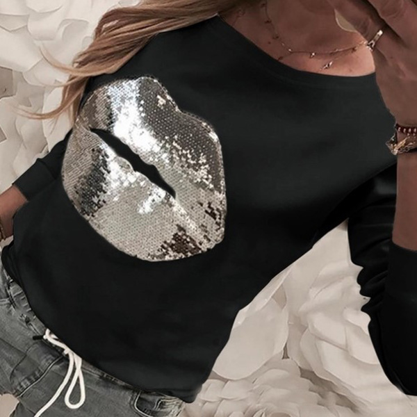 Fashion Sequin Lip Pattern Long Sleeve Round Neck Sweatshirt