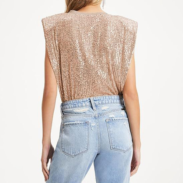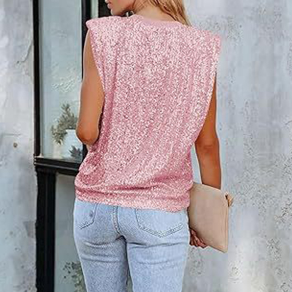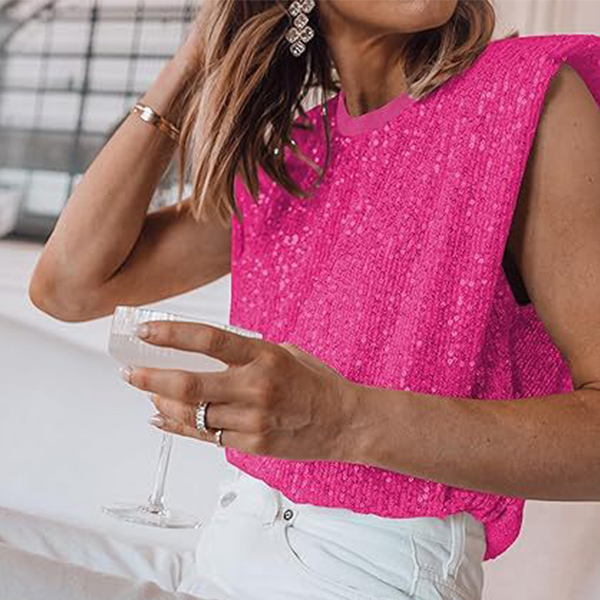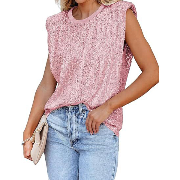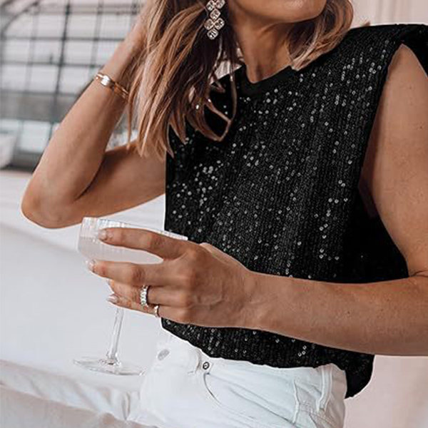 This shirt features a round neck design, sleeveless silhouette, and sparkling sequins for a fashionable and show-stopping look.