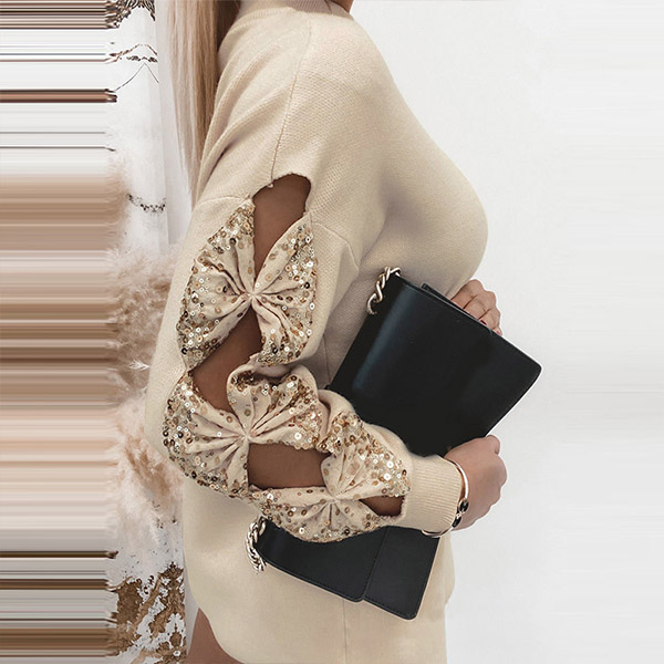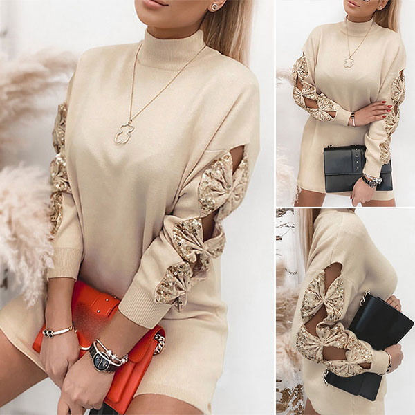 When the autumn season hits,this knit dress can be your wise choice. What makes this piece look so attractive? It owes to the sequin spliced bow-knot design at the sleeve part. Meanwhile,the mock neck and soft knitted fabric can ensure you a warm and comfortable day. Try to match with a sparkle sweater necklace to boost your entire charm.