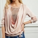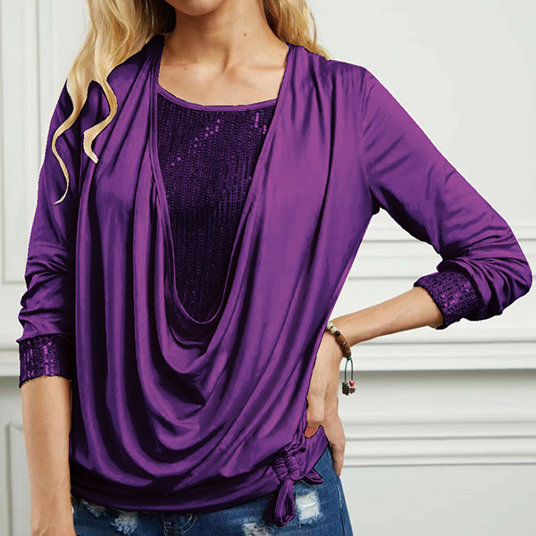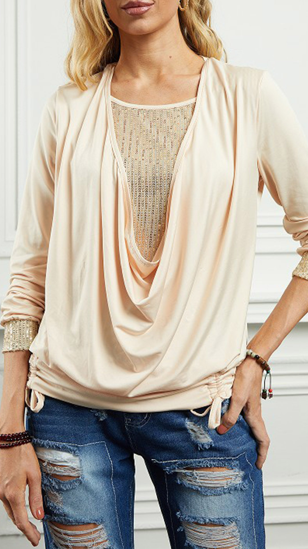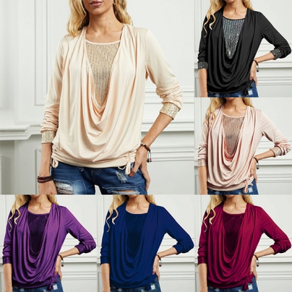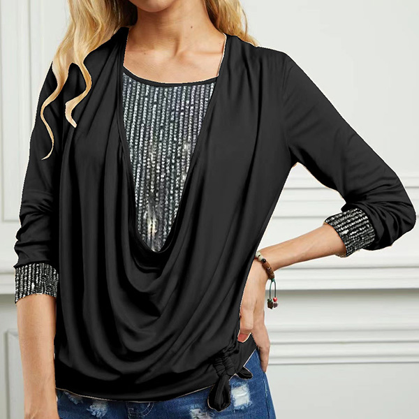 Fashion Sequin Spliced Draped Neck Long Sleeve Shirt