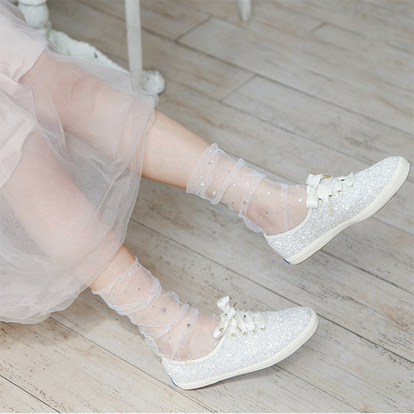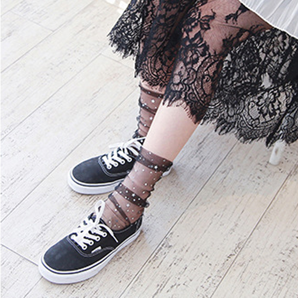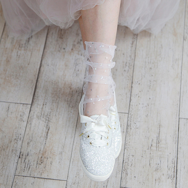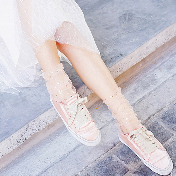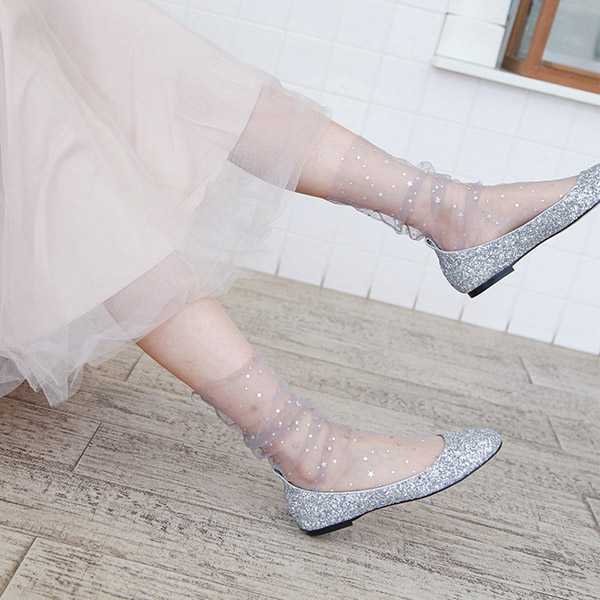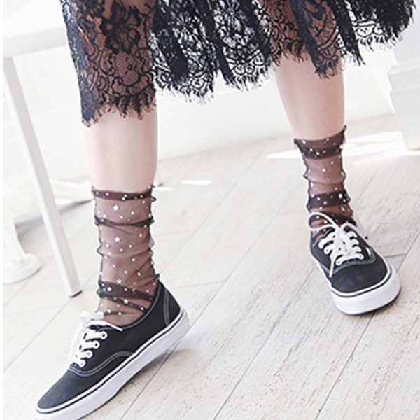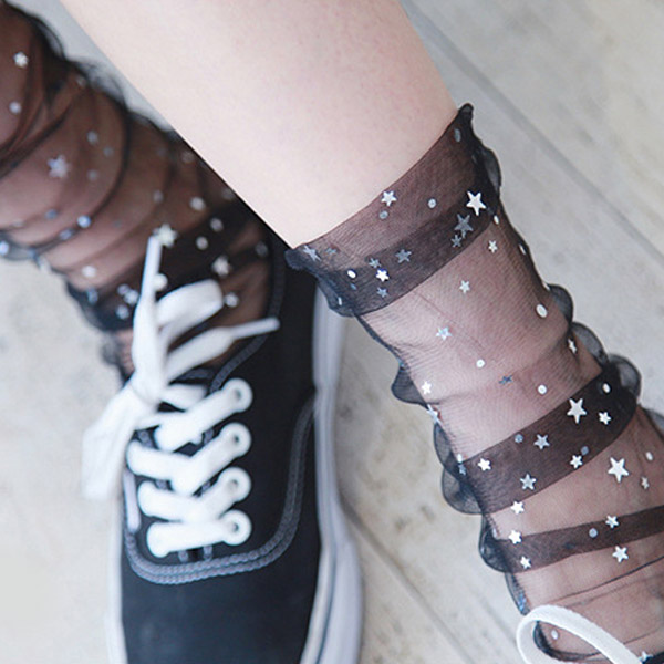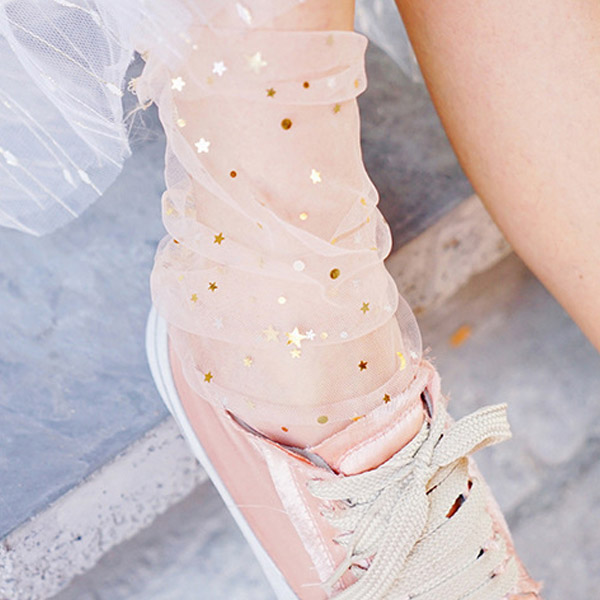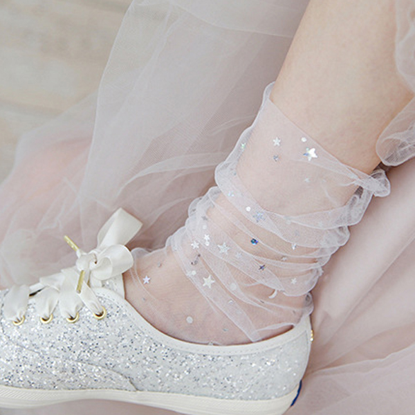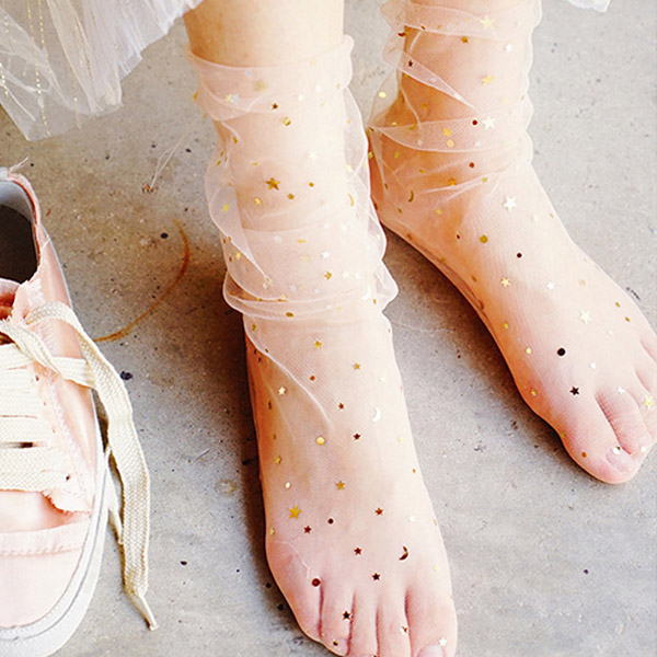 Only need one glance,you would be attracted by this pair of chic and stylish socks. The star and crescent sequin details make it look so romantic and shinning,and the see-through gauze design will lend you some femininity. It is a good addition to boost your entire charm.