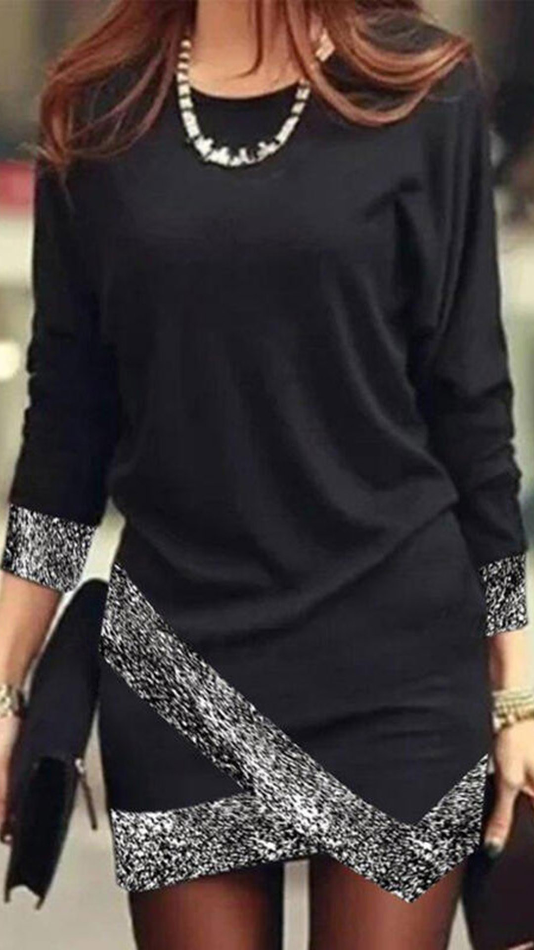 Don't like too simple and dull dress? Then you can have a look at this dress. The sequin spliced details and irregular hem design make it look so distinctive and attractive. Finished with long sleeve,round neck and a clean silhouette,this dress is sure to offer you a cozy yet stylish daily style.
