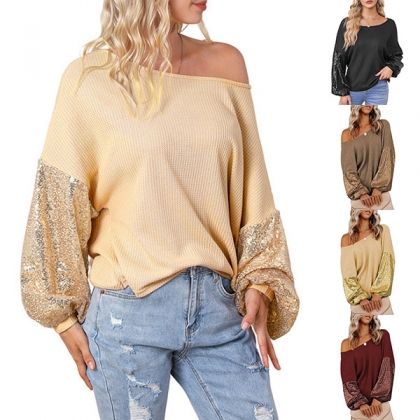 Fashion Sequin Spliced Lantern Sleeve Round Neck Knit Top