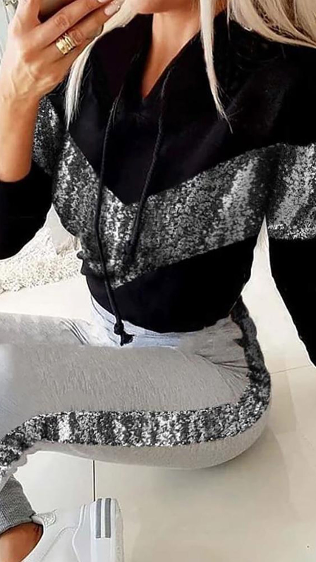 Fashion Sequin Spliced Long Sleeve Hooded Sweatshirt + Pants Two-piece Set