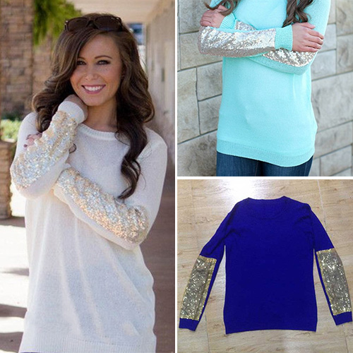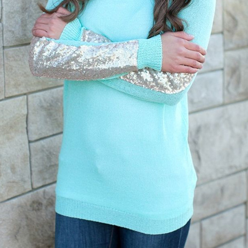 Fashion Sequin Spliced Long Sleeve Round Neck Knitted Tops