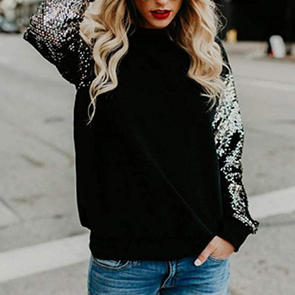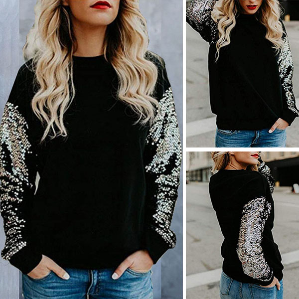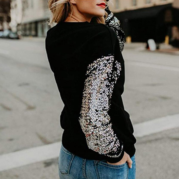 When the autumn season hits,this cozy yet stylish sweatshirt can easily strike your mind. The sequin spliced details at the sleeve part are the highlights,which make this piece look so shinning and attractive. You can simply matching with a jeans to have a simple,laid-back but fashionable daily look.