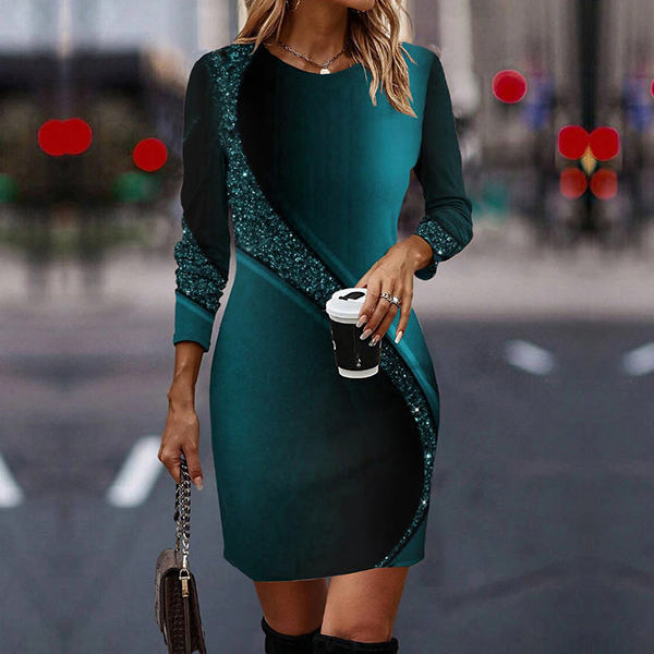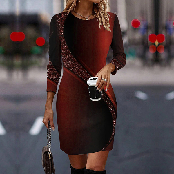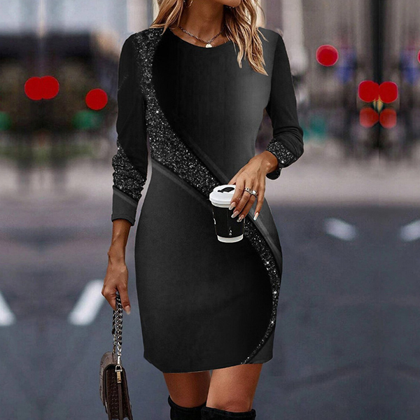 Fashion Sequin Spliced Round Neck Long Sleeve Mini Dress