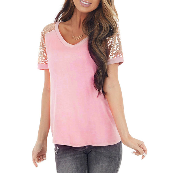 This t-shirt comes with a sweet pink tone,crafted form soft and breathable fabric,which can offer you a comfortable day. What's more,the sequin spliced details at the sleeve part will make this piece full of style and charm. No matter matching with a shorts,skirt or jeans,you can hardly go wrong!
