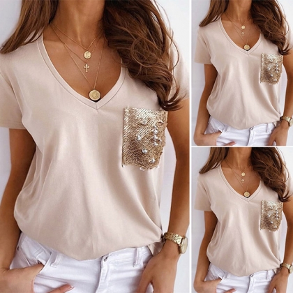 This t-shirt that combines of simple,cozy and stylish vibes is worth to have a place in your wardrobe. It is crafted from soft and breathable fabric,with short sleeve and v-neck design,which can offer you a long-lasting comfort,while the sequin spliced chest pocket design will add some extra charm. No matter what kind of bottoms you pair with,it can hardly go wrong!