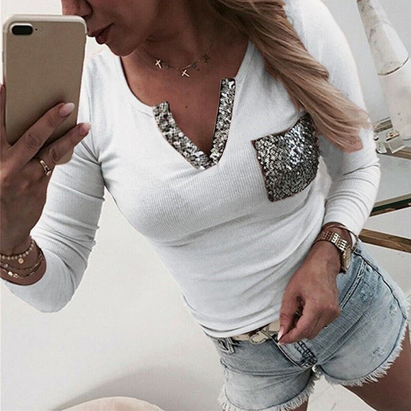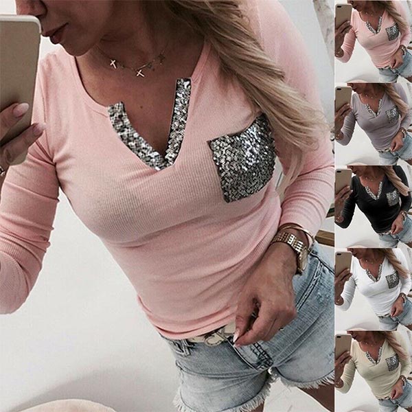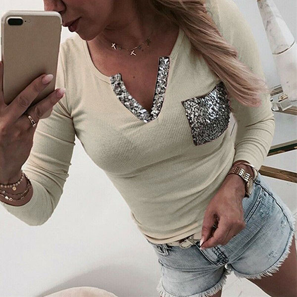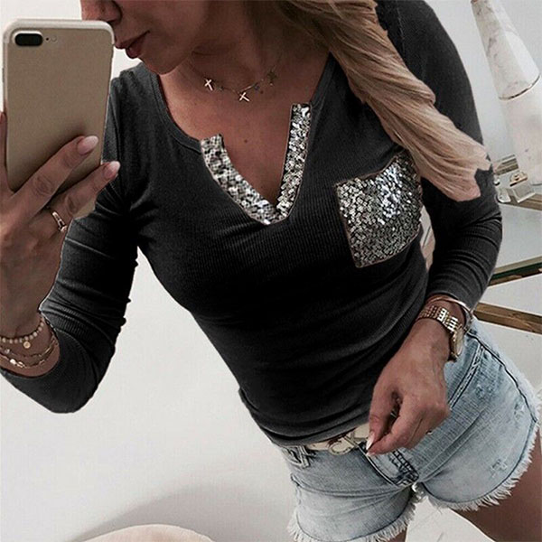 Fashion Sequin Spliced V-neck Long Sleeve T-shirt (It falls small)