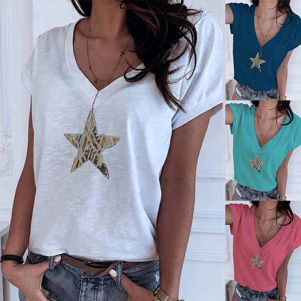 The short sleeve t-shirts are the quintessential must-have items in the summer days. So how about this piece? Designed with short sleeve,v-neck and soft fabric,this piece can offer you a cool and comfortable day. And the sequin star design breaks the simple and dull design style. This t-shirt can maintain the comfy as well as offer you many matching styles.