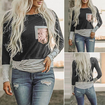 Fashion Sequin Striped Spliced Long Sleeve Round Neck T-shirt