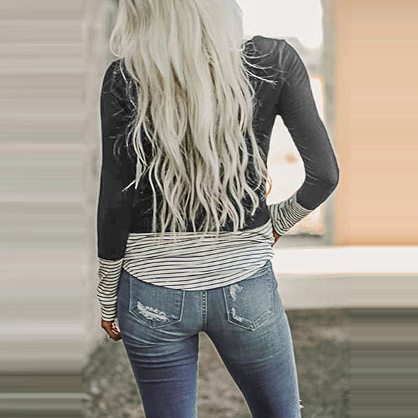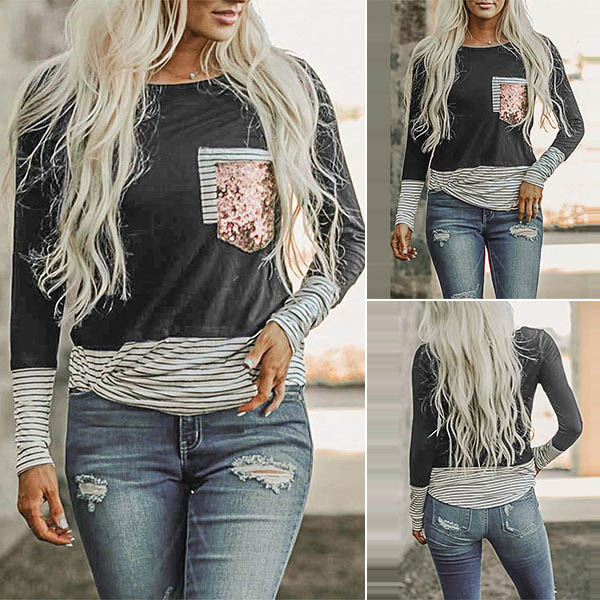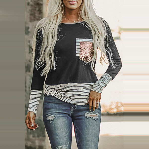 This long sleeve t-shirt is a perfect choice when the days get a little cold. The striped spliced details and sequin pocket design make this piece look more attractive,while its soft and breathable fabric can ensure you a comfortable day. Just invite it to your casual wardrobe ensemble!