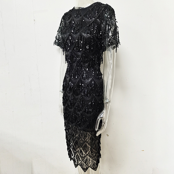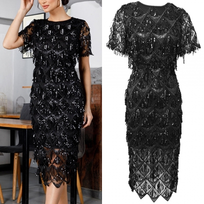 This bling-bling party dress features sequin embellishments tassel detailing, a crew neck, and short sleeves, creating a glamorous and eye-catching look. Pair it with high-heeled shoes for a fashion party look.