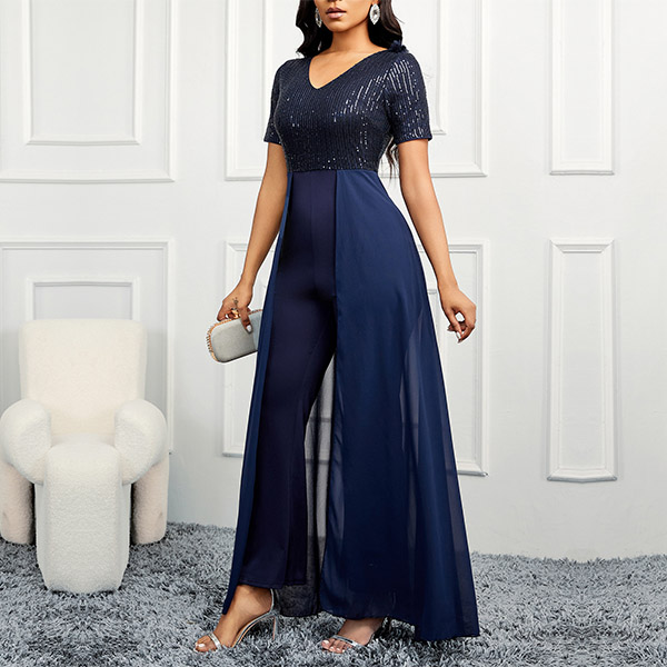 This bling-bling jumpsuit features a sequined bodice, V-neckline, short sleeves, and wide-leg chiffon pants for a stunning and fashionable look. Wanna have a try?