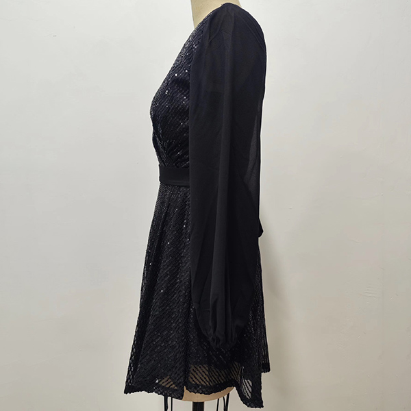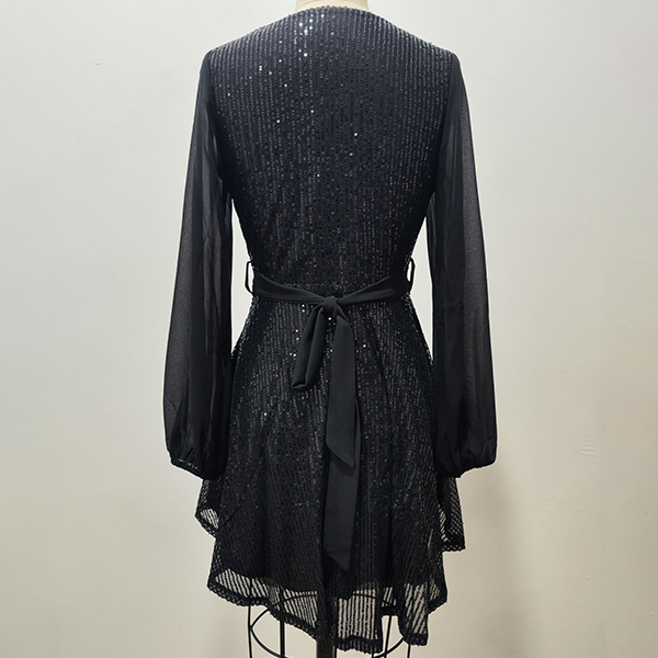 This dress combines sequin embellishments with gauze splicing to create a stunning and trendy look.