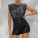A sexy fashion romper featuring sequined spliced artificial leather, sleeveless design, and a slim fit.