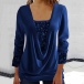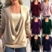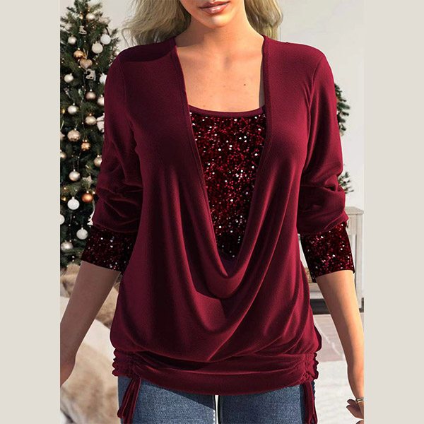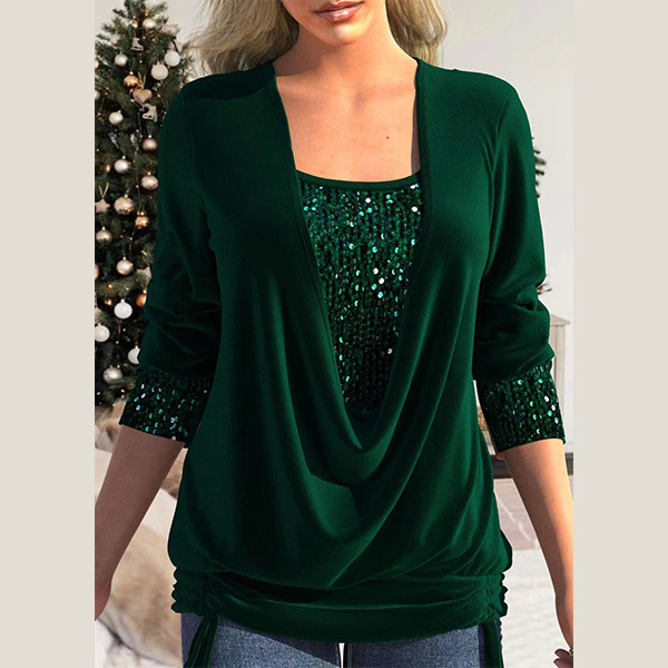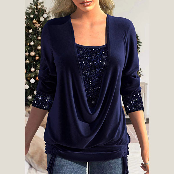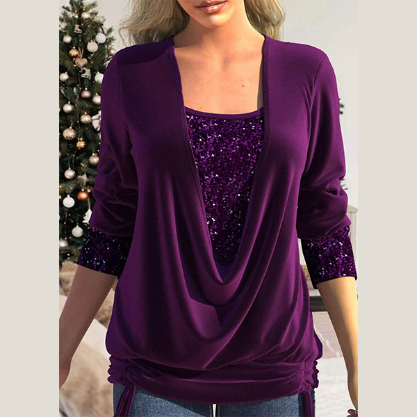 Fashion Sequined Spliced Draped Neck Ruched Long Sleeve Shirt