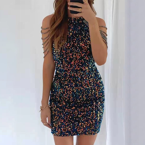 Fashion Sequined Tassle Round Neck Bodycon Party Dress