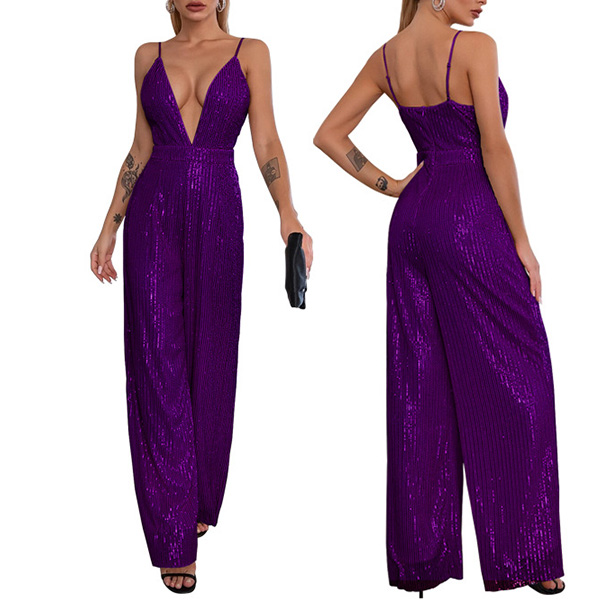 Cette combinaison présente un décolleté en V flatteur et est ornée de paillettes scintillantes qui ajoutent du glamour et de l'éclat à l'ensemble. La silhouette à jambes larges offre une allure chic et tendance, ce qui la rend adaptée à de nombreuses occasions, qu'il s'agisse d'une soirée en ville ou d'un événement formel. Disponible en plusieurs couleurs.