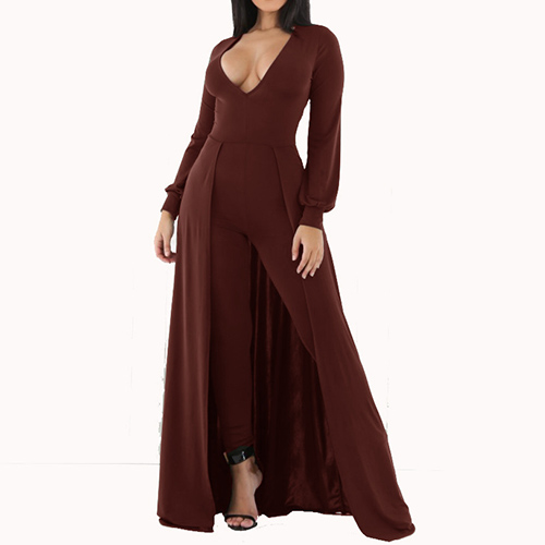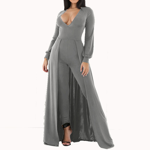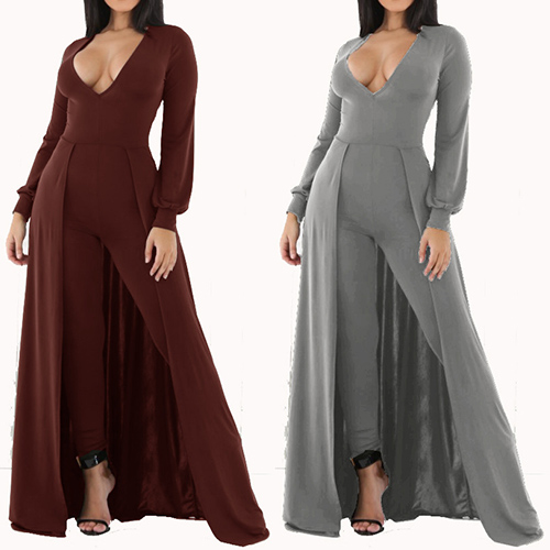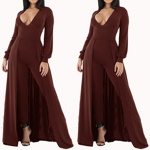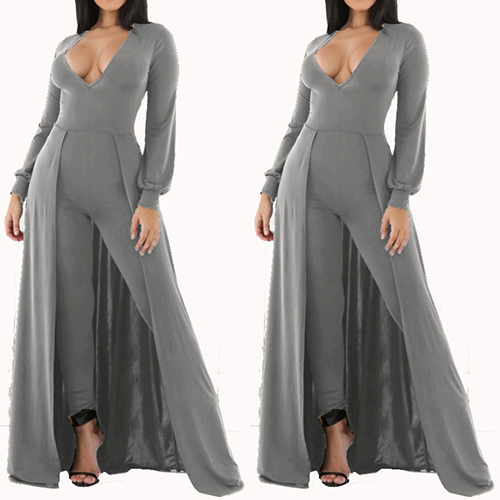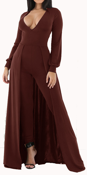 solution to sleek dressing. The jumpsuit is outfitted with solid color and deep V-neck design, sexy and sultry. You