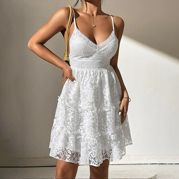 Step into the spotlight with this fashion-forward and seductive lace slip dress. The V-neckline beautifully frames your décolletage, exuding an air of elegance and allure. The back-tie bowknot detail adds a playful and flirty element, while also allowing you to adjust the fit to your liking. The delicate white lace adds a touch of femininity and sophistication, making this dress perfect for special occasions or a night out.