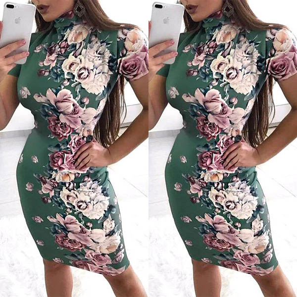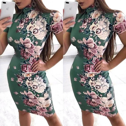 Fashion Short Sleeve Mock Neck Slim Fit Printed Dress