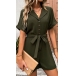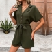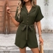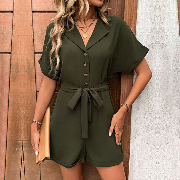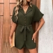 Fashion Short Sleeve Notch Lapel V-neck Button Self-tie Belt Romper