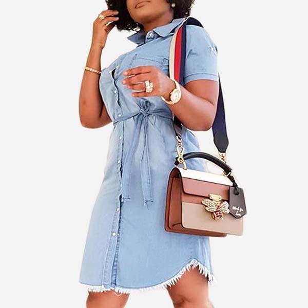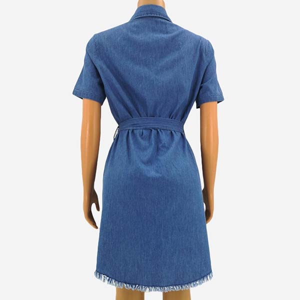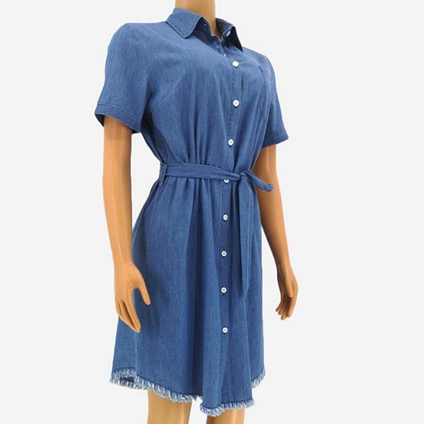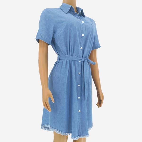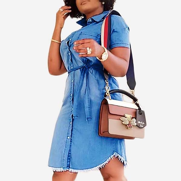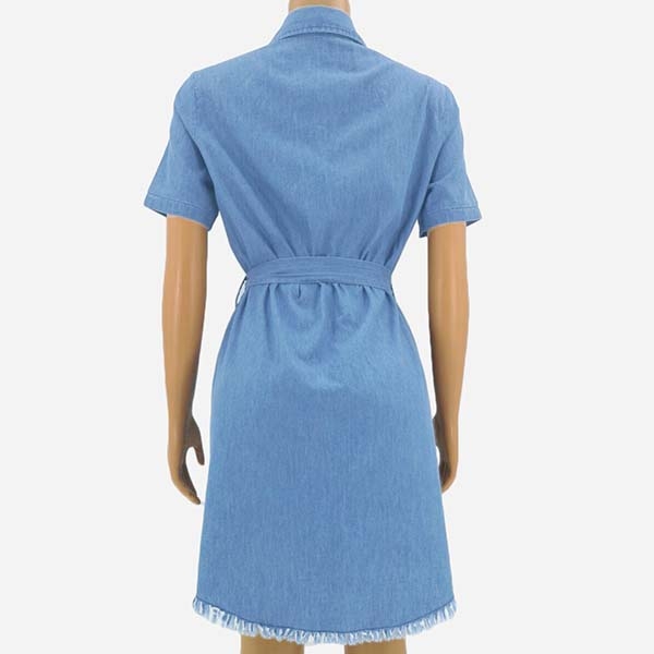 You can easily update your style when you wear this denim dress. It is finished with short sleeve,
