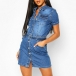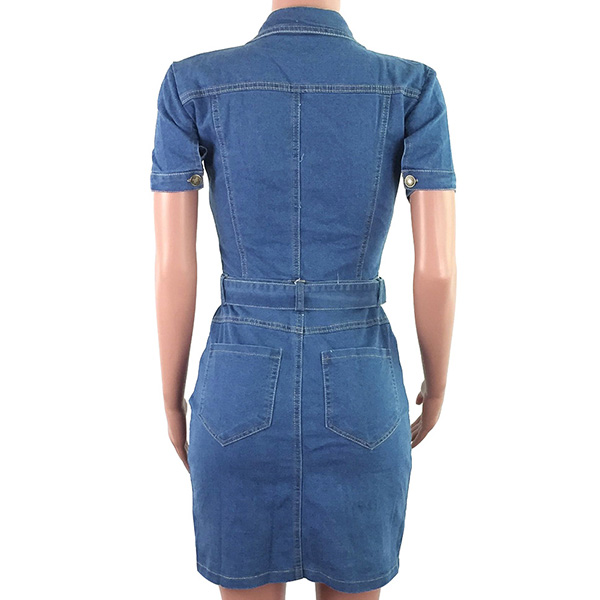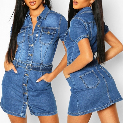 Fashion Short Sleeve POLO Collar High Waist Slim Fit Denim Dress