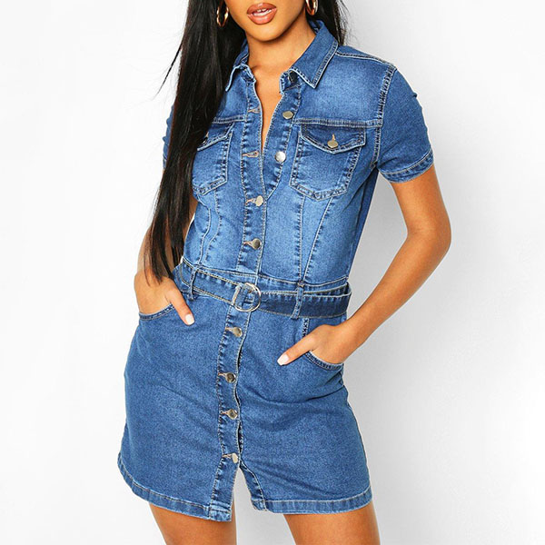 You can easily exude your charming feminine appeal when you dress yourself up with this denim dress. It is finished with short sleeve,POLO collar and single-breasted design.classic yet stylish. Meanwhile,the high waist and fit silhouette design can showcase your slender figure. You can just enrich your wardrobe with this denim dress!