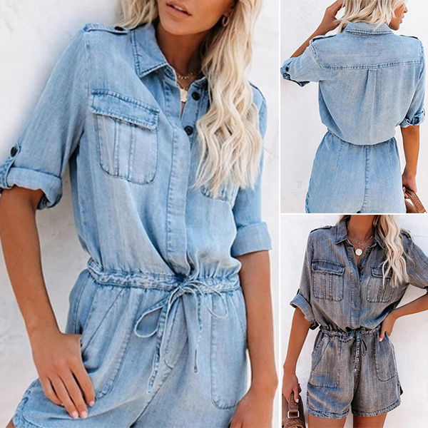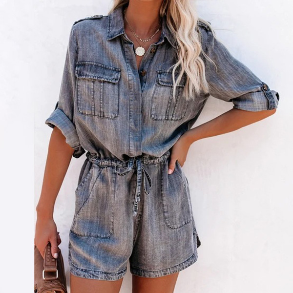 Fashion Short Sleeve POLO Collar High Waist Slim Fit Denim Romper