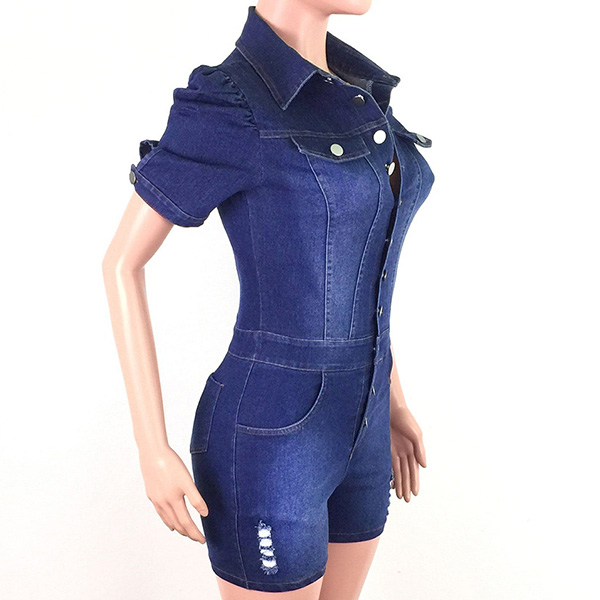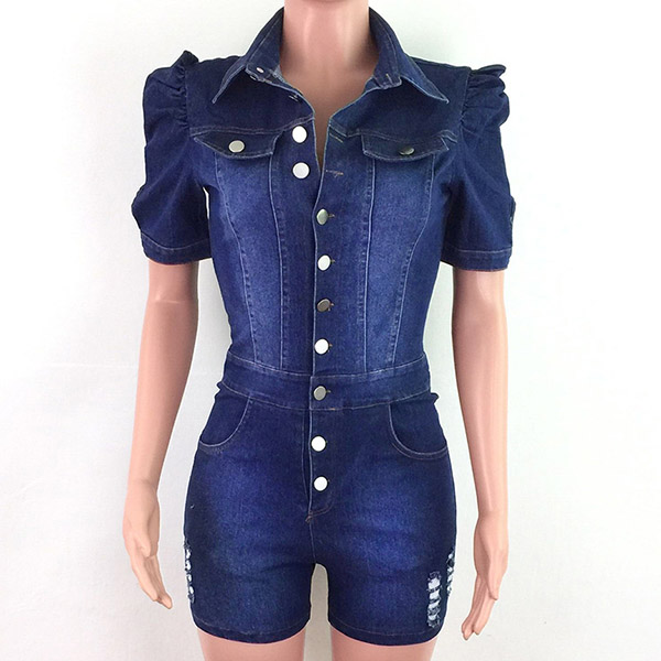When you wanna update your daily style,then you can have a try this denim romper. It is finished with short sleeve,POLO collar and high waist design,this denim romper not only can showcase your slender figure,but also can boost your entire charm. And the ripped details will make this piece look more attractive. It is perfect fit for you in these summer days.