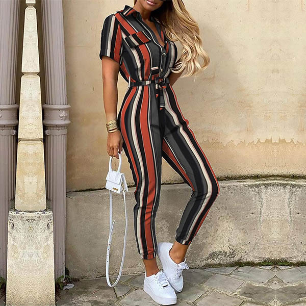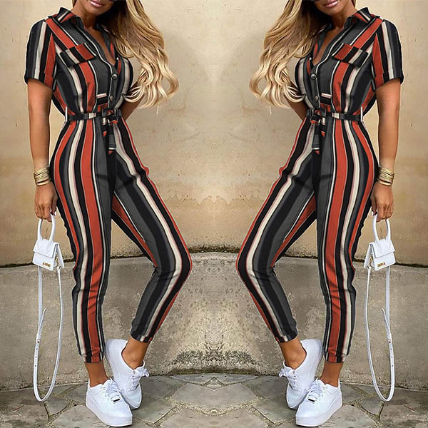 For moments when you're short of time for wardrobe mix and match,you can settle for this easy-to-wear this jumpsuit. Striped style,finished with short sleeve,POLO collar and high waist design,this piece is sure to showcase your slender figure while it exude your chic style and personality.