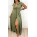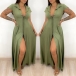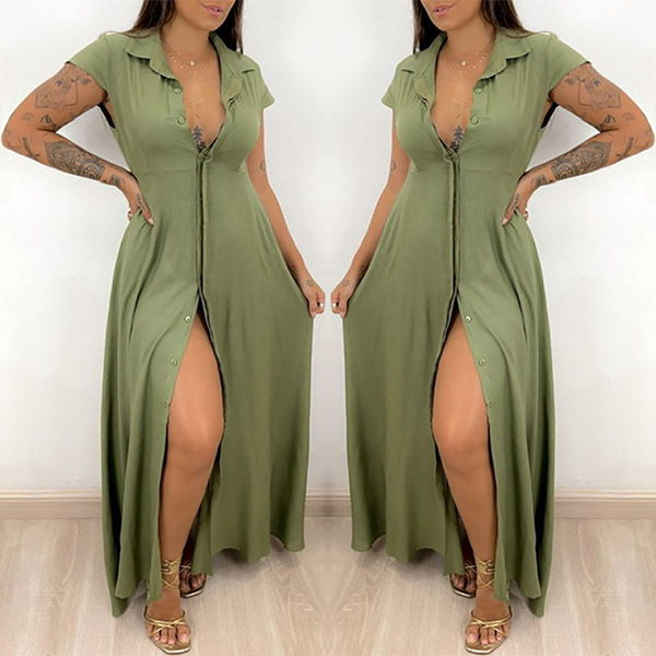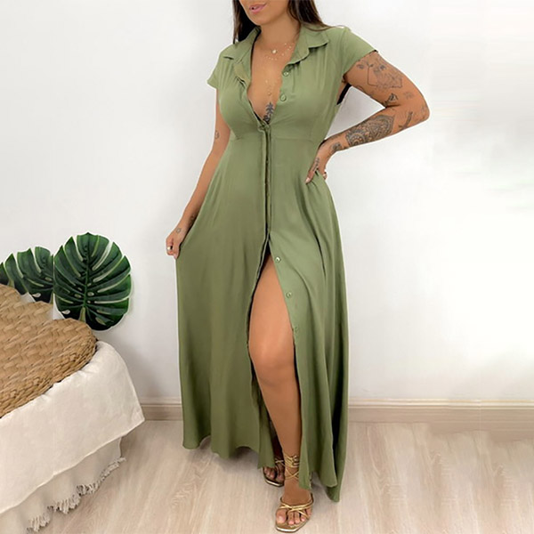 Fashion Short Sleeve POLO Collar Solid Color Slit Hem Shirt Dress