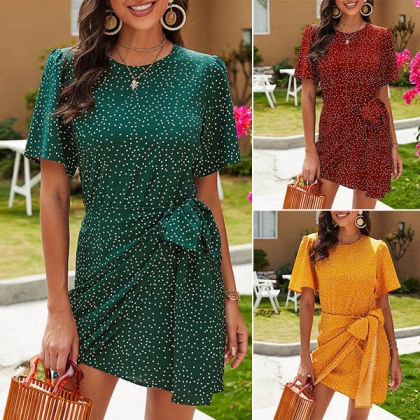 Fashion Short Sleeve Round Neck Dots Printed Lace-up Dress