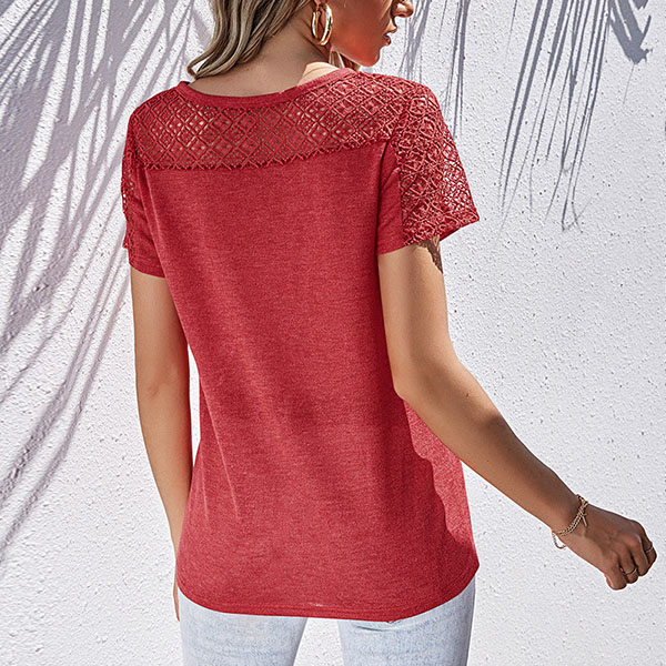 Your wardrobe calls for such a cozy,stylish and all-match t-shirt. It comes with a solid color,the hollow out crochet spliced details can easily enhance its entire charm. All-match design allows to be matched with different style bottoms. So why not take interest in it?