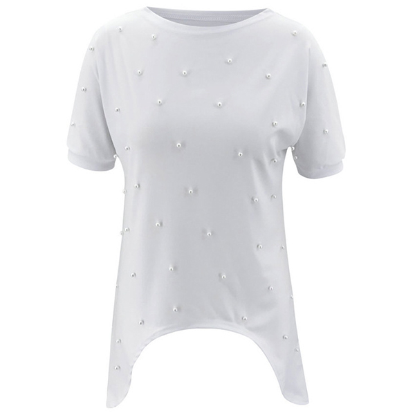 Fashion Short Sleeve Round Neck Irregular Hem Beaded T-shirt
