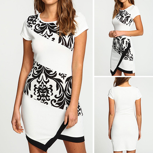 ultra-feminine number! It features chic printed pattern,with a round neckline,an irregular hem