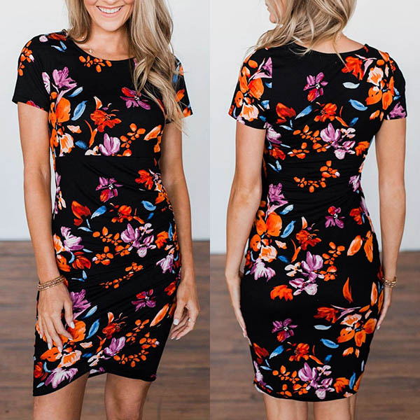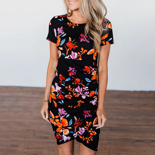 Fashion Short Sleeve Round Neck Irregular Hem Slim Fit Printed Dress