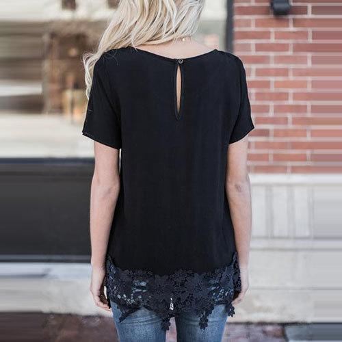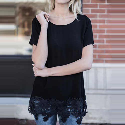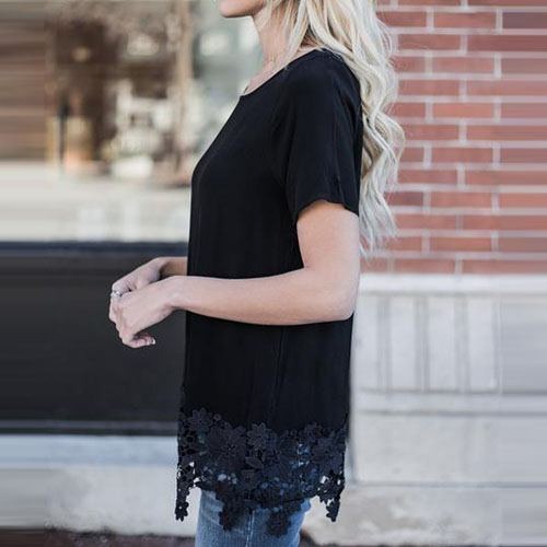 Solid color style,crafted from soft and cozy fabric,with short sleeve,round neck and lace spliced hem,this t-shirt definitely can