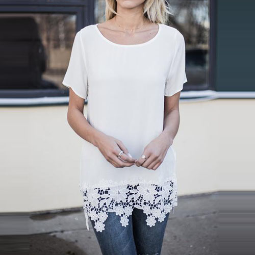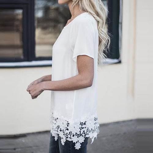 Fashion Short Sleeve Round Neck Lace Spliced Hem T-shirt